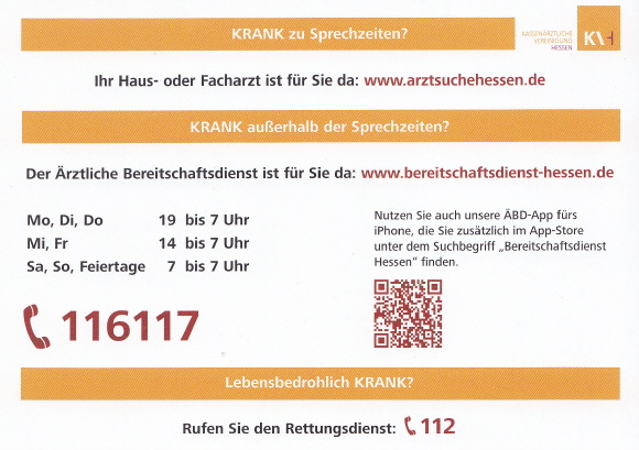 Außerhalb unserer Sprechzeiten ist der ärztliche Bereitschaftsdienst für die Notfallversorgung zuständig. Bitte wenden sie sich Montags, Dienstags und Donnerstags in der Zeit von 19:00 bis 7:00, Mittwochs ab 14:00 bis Donnerstags 7:00 und Freitags ab 14:00 bis Montags 7:00 direkt an die Bereitschaftsdienstzentrale in der Grafenstr. 9 (EG Frauenklinik) Tel. 116117